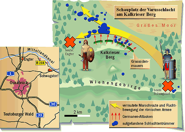 Die geographischen Gegebenheiten in Kalkriese lassen in einzigartiger Weise erahnen, wie sich das für die Entwicklung des rechtsrheinischen Germaniens so bedeutende Ereignis abgespielt hat. Der Gesamtkomplex mit der Präsentation der Grabungsfunde macht den besonderen Reiz dieser historischen Stätte aus. Das Untersuchungsgebiet im Bereich der Stadt Bramsche und der Gemeinde Ostercappeln erstreckt sich über eine Fläche von 30 Quadratkilometern, dem gesamten Engpaß zwischen dem großen Moor im Norden und dem Kalkrieser Berg im Süden.