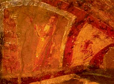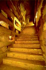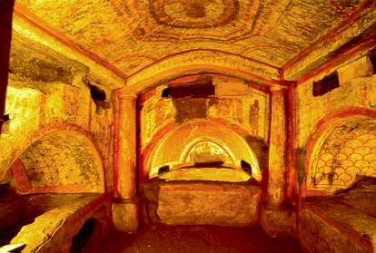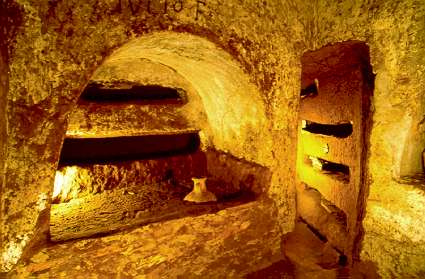 Die Symbole und die Fresken sind somit ein Evangelium in Miniaturausgabe, eine Zusammenfassung des christlichen Glaubens. Nach römischem Recht durften Tote nur außerhalb der Stadt begraben werden. An den Straßen vor den Stadttoren bildeten sich regelrechte Totenstädte, und mit der Zeit wurde der Platz knapp. Die Christen begannen wohl als erste, ihre Toten in unterirdischen Gängen zu bestatten, es gibt aber auch heidnische und jüdische Katakomben. Es entspricht nicht der Wahrheit, daß sich Christen vor den Verfolgungen in den Katakomben versteckt haben, denn die Katakomben waren den römischen Behörden bekannt. Besonders sehenswert sind die Priscilla-Katakomben (Via Salaria Nuova 430), da sie nicht so stark überlaufen sind wie jene an der Via Appia.