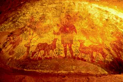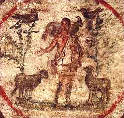 Der Gute Hirte mit dem Schaf auf seinen Schultern stellt den Erlöser, Christus, dar mit der von Ihm geretteten Seele. Dieses Symbol findet sich sehr häufig auf Fresken, Sarkophag-Reliefs und als Statue, außerdem findet es sich eingeritzt in Grabplatten.