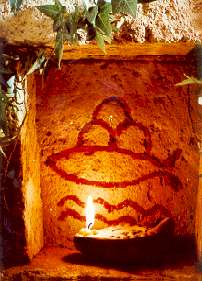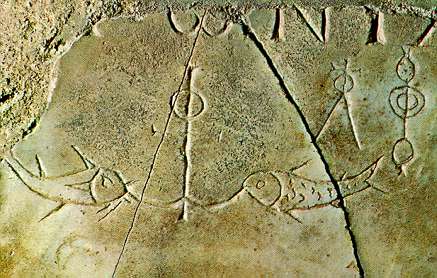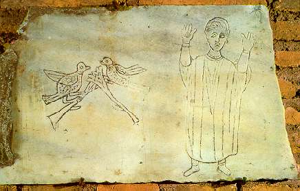 Symboldarstellungen in römischen KatakombenDa die Christen ihren Glauben nicht offen bekennen konnten, benutzten sie Symbole, welche sie an die Wände der Katakomben malten oder noch häufiger in die Marmorplatten einritzten, welche die Gräber verschlossen.