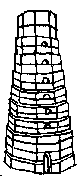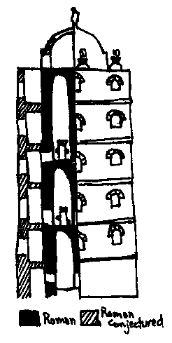 In Dover, England, the Romans built two lighthouses. The eastern lighthouse (fig. 4) still stands, though few external materials remain due to medieval refacing. The lower thirteen meters of the twenty-four meter high lighthouse retains its Roman form. The lighthouse has an octagonal exterior with walls decreasing in thickness from 3.65 meters to 1.5 meters in a series of eight steps (Hague and Christie 64). The Roman interior, 4.2 meters square, has perpendicular walls and beam holes which indicate that the floors were wooden. Access to the top of the lighthouse was probably obtained from vertical ladders since no physical evidence of stairs exists. The top platform of the lighthouse may have been either vaulted or a fire proof wood construction with an insulating layer of stone slabs. Keepers probably lifted fuel by internal winches or external cranes (Hague and Christie 66).