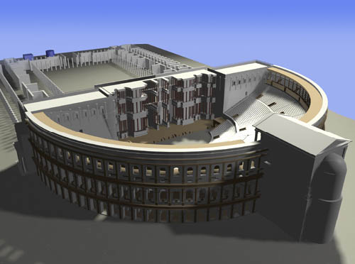 und der wurde ja auch umgebracht. Theater und BühneTrotz oder wegen der Theaterbegeisterung der Römer hielt es die Obrigkeit fast zweihundert Jahre lange nicht für geboten, ihnen ein festes Theater zu bauen, vielleicht auch aus Nationalstolz: Wie römische Diplomaten im Ausland gern Unkenntnis des Griechischen simulierten und sich dolmetschen ließen, so sollte Rom nicht das Bild einer Stadt der Graecia capta bieten. Erst im Zuge der Hellenisierung des spätrepublikanischen Roms wurde dann i. J. 55 v. Chr. auf dem Marsfeld von Pompeius dem Großen das nach ihm benannte "Theatrum Pompei", oder auch "Theatrum Magnum", eingeweiht; von den meisten griechischen Theatern war es dadurch unterschieden, dass es sich nicht an einen natürlichen Bergabhang schmiegte, sondern einen selbständigen Bau (wie etwa der Circus Maximus oder ein heutiges Stadttheater) darstellte. Ihm folgten andere wie das berühmte Marcellustheater und schließlich die vielen römischen Theater des Imperium Romanum, deren Reste wir noch heute in Italien, Spanien, Südfrankreich usw. bewundern.