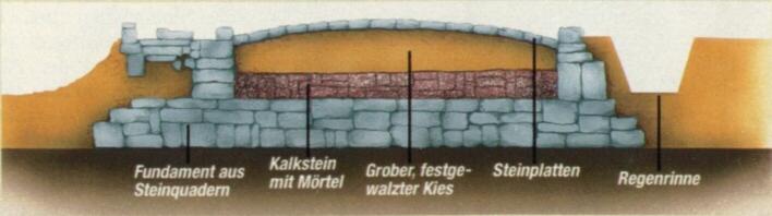 Die TechnikNach den geschichtlichen Details jetzt zu den technischen: Zu den alten Kiesstraßen gibt es nicht viel zu sagen. Für sie wurde der Untergrund festgestampft und mit Kies beworfen.Die Beschreibung der Pflasterstraßen dagegen ist etwas komplizierter, allein deshalb, da sie häufiger erhalten blieben und uns über sie mehr überliefert wurde. Der Bau einer römischen Straße stellte ein komplexes Vorhaben dar. Bei der Planung strebte man an, stets die kürzeste Entfernung zu wählen, d.h. möglichst gerade Linien zu ziehen. Um natürliche Hindernisse wie Berge, Täler, Sümpfe zu überwinden, scheute man sich nicht, Erdwälle aufzuschütten, Brücken zu bauen, Sümpfe trockenzulegen oder gar Tunnel zu graben, was allerdings seltener der Fall war. Wenn das nicht ging, baute man die Straße steil hinauf oder hinab. Umwege wurden nur im Notfall gemacht. Nach den notwendigen Messungen des Landvermessers zog man rechts und links von der späteren Straße Gräben, die das Regenwasser ableiteten. Dazwischen wurde ein Graben ausgehoben, der bis zu anderthalb Meter tief sein konnte. Dieser wurde dann in verschiedenen Schichten mit am Ort befindlichen Materialien gefüllt. Als Fundament diente dabei eine Schicht aus Steinplatten. Die Fugen wurden mit einem Vorläufer des heutigen Betons ausgefüllt. Darüber folgte eine Schicht mit grobem Schotter und darüber eine Schicht mit feinem Schotter oder Kies. Diese beiden Schichten sollten zur Entwässerung dienen. Auf diesem Untergrund wurden schließlich die großen Steinplatten verlegt, die meist unregelmäßig geformt waren. Zum Schluß wurde die Straße glattgestampft, so daß sie zu den Seiten sanft abfiel und so das Regenwasser in die Gräben ablief.