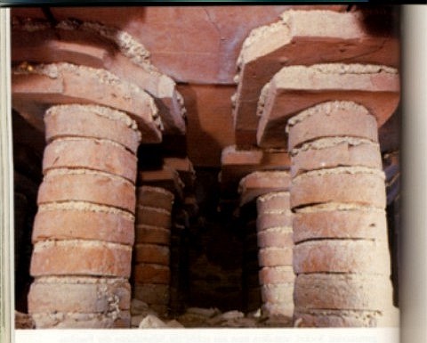 Hypokaust in der römischen Villa von Neuenahr-Ahrweiler: Der Blick geht vom Praefurnium in den Hypokaust des Raumes. Die Hypokaustpfeiler sind 60cm hoch aus runden Ziegeln mit Kalkmörtelbindung aufgebaut. Sehr gut erkennbar ist die Konstruktion der Suspensura: die letzten drei Ziegelplatten eines Hypokaustpfeilers werden jeweils um eine Nummer größer gewählt, bis die letzte Platte preß mit ihren Nachbarn aneinander stößt und so eine lückenlose Schalung für den darüber zu gießenden Estrichboden bildet.