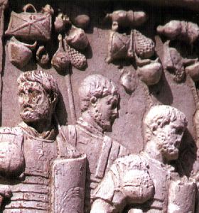 Marschgepäck eines römischen Legionärs an der Tragestange (Trajanssäule,Rom)