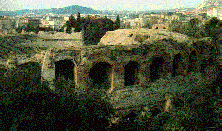 Pozzuoli, Amphitheatrum Flavium - Sicht aus Nordosten Allgemein wird der Bau des Amphitheaters in flavischer Zeit angesetzt - gleichlautende Inschriften an den 4 Toren der Längs- und Querachsen bestätigen dies: COLONIA FLAVIA AUGUSTA PUTEOLANA PECUNIA SUA: "Die Gemeinde Puteoli, ausgezeichnet vom Kaiser mit dem Titel Colonia Flavia Augusta hat das Bauwerk auf eigene Kosten errichtet." Das war eine große Leistung, auch wenn der Bau sich über Jahrzehnte erstreckte und die Ausschachtung unter Arena-Niveau und der Ausbau der Carceres für die Tiere erst unter den Nachfolgern Domitians in jüngerer Technik reinen Ziegelbaus aller Pfeiler vorgenommen wurde. Erwägenswert ist jedoch auch auf Basis jüngerer epigraphischer Funde ein Bau bereits neronischer Zeit, der sich gut in Neros hochfliegende Pläne zur Erweiterung der Kolonie, die u.a. die Anlage eines Durchstichs von Baiae zum Lago di Licola und eine Kanalverbindung bis Ostia vorsahen, einfügen würde. Auch der Gebrauch von opus reticolatum in einigen erhaltenen Bauabschnitten würde eine solche Datierung stützen. Dann wäre das Amphitheater identisch mit demjenigen, in dem i.J. 66 die von Cassius Dio überlieferten großartigen Spiele zu Ehren des Tiridates, des Königs von Armenien, stattfanden. In diesem Fall würde sich die o.g. Inschrift auf die Fertigstellung oder weitere künstlerische Ausgestaltung beziehen (vor allem,wenn man sich vor Augen führt, daß die Erwähnung des Namens Nero infolge seiner damnatio memoriae zu vermeiden war).