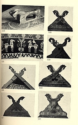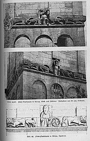 Glockenturm von St.Peter und Paul zu Hirsau im Schwarzwald (erbaut von 1083-1091) Ähnlich dem Murrhardter Bogenfeld, auf dem der abgöttische Sonnendiener mit seinem Heilszeichen von dem christlichen Priester mit dem Weihwedel gebannt wird, ist das Rad wohl als Sinnbild der Sonne und ihres Dienstes; die bärtige Gestalt ist wohl als Wotan mit Kraftgürtel oder, hier im Land der Alemannen, Ziu anzusehen. Die Anbringung der Gestalten und der Sinnbilder der Sonnenverehrung bedeutet auch hier, daß diese feindlichen Gottheiten dadurch gebannt, unschädlich gemacht werden sollten. Hinzu kommt, daß dem neubekehrten Alemannen die Absage an die alten Götter nun vor ihrem Steinbild viel leichter werden mußte, wenn er sie so dasitzen sah, an die Außenseite der Kirche gebannt, hilflos neben unreinen und bösartigen Tieren. Wenn sie das dulden mußten, so war ihre Macht ja offenbar völlig gebrochen.