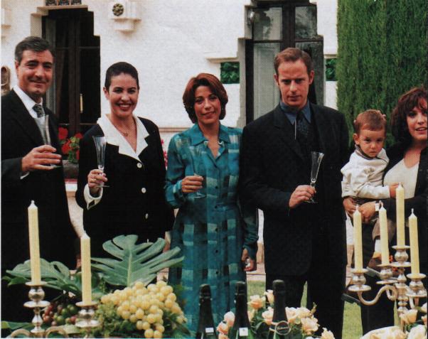 Foto nadalenca dels Montsolís. D'esquerra a dreta: Raimon Montsolís, Pilar Solano, Eulàlia Montsolís, Eduard Montsolís, i Isabel Pomer amb Rogeret Montsolís. Imatge escanejada per Marga i proporcionada per Atreida.