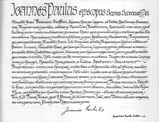 Copia della nomina con cui, il 20 luglio 1999, il Santo Padre ha chiamato