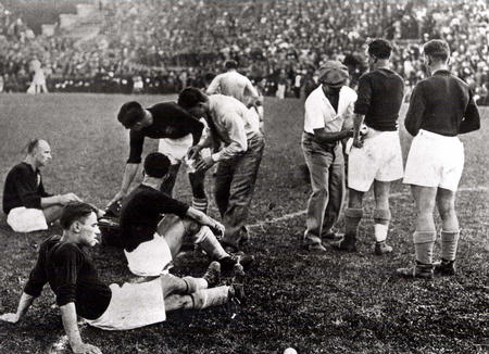 | El equipo checoslovaco descansa en el centro del campo antes del comienzo de la prórroga de la final contra Italia. El equipo de Karel Petru inauguró el marcador por medio de Antonin Puc a un cuarto de hora del final del encuentro. Seis minutos más tarde, Raimondo Orsi lograría el empate. |