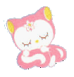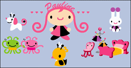 No official info on these characters as yet. They were found in a flash presentation at www.sanriowave.com. I was able to read their names though. The girl, of course, is Pauline. The bunny is Pepe, the puppy is Pupu, the bird is Pipi, the octopus-like creatures are Pinpin (green one) and Ponpon (pink one) and the bed, chair and hatstand are Pauline's bedroom!