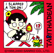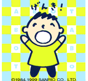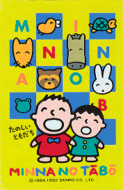 Minna No Tabo is a comic-strip character. He features in the Japanese Sanrio magazine, The Strawberry News. He is very grouchy, he loves to brag, and is very talkative. He lives with his Mom, Pop, younger brother Ma-Kun, and many animals friends, including Dog, his best friend, Little Chick, Dolphin, Seal, Bear, Rooster, Crocodile, the turtles, Rabbit, Elephant, and Penguin. When Tabo's birthday comes around, it is always celebrated with a birthday cake and a rice cake filled with bean pasting, wrapped in an oak leaf. He likes playing sports, and hates green peppers.