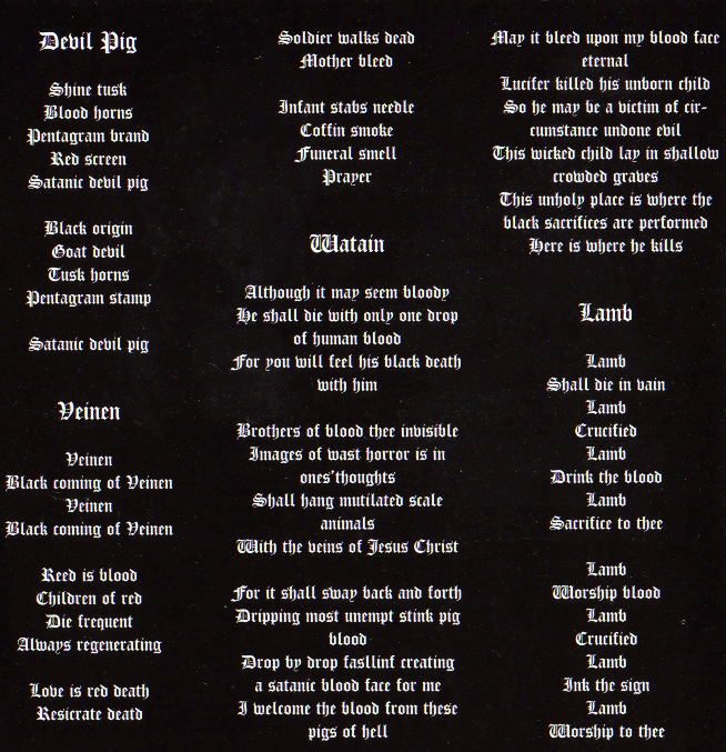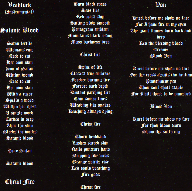 These are the lyrics for the Satanic Blood demo as printed in the Hammerheart release