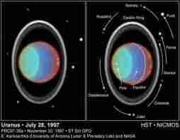 太 陽 系 的 第 七 顆 行 星 命 名 為 天 王 星 ﹐ Uranus﹐ 的 原 因 是 因 為 “他” 是 Saturn 神 的 父 親 ﹐ 是 Jupiter 的 爺 爺 。 而 在 古 羅 馬 ﹐ Uranus 是 代 表 天 空 之 神 之 意 ﹐ 估 中 文 翻 譯 為 天 王 星 。 天 王 星 也 是 一 顆 由 氣 體 組 成 的 行 星 。 體 積 在 太 陽 系 中 排 行 第 三 ﹐ 但 她 赤 度 上 的 直 徑 也 只 不 過 是 木 星 的 三 份 之 一 ﹐ 大 約 是 51,000 公 里 。 不 過 地 球 的 赤 度 圓 周 也 只 是 四 萬 多 公 里 ﹐ 她 的 體 積足 夠 容 納 六 十 四 個 地 球 。 跟 其 他 兩 個 氣 態 行 星 一 樣 ﹐ 天 王 星 的 自 轉 速 度 也 很 快 ﹐ 一 “ 天 王 星 日 ” 也 只 不 過 是 地 球 的 17 小 時 57 分 06 秒 。 但 一 “ 天 王 星 年 ” 則 比 土 星 多 2.85 倍 ﹐ 所 需 的 時 間 是 84 地 球 年 。 天 王 星 是 第 一 個 由 “現 代”天 文 學 家 所 發 現 的 行 星 ﹐ 金 、 木 、 水 、 火 、 土 五 個 行 星 都 已 在 兩 千 多 年 以 前 被 發 現 的 。 這 星 球 是 由 William Herschel 在 1781 年 所 發 現 的 。 他 命 名 此 星 為 英 皇 喬 治 三 世 。 而 “ 天 王 星 ” 這 個 名 字 是 後 來 Bode, Johann Elert (1789-1826) 名 命 的 ﹐ 原 因 是 本 著 “ 古 代 行 星 名 命 法 ” ﹐ 土 星 以 前 的 五 個 行 的 都 是 以 古 羅 馬 的 神 名 命 的 。 大 部 份 行 星 的 自 轉 軸 都 是 垂 直 的 “站 立” 在 公 轉 軌 道 的 平 面 上﹐ 可 是 天 王 星 的 自 轉 軸 則 是 躺 臥 在 她 的 軌 道 平 面 上 。 1986 年 ﹐ 航 海 家 2 號 掠 過 天 王 星 時 ﹐ 其 南 極 點 差 不 多 ﹐ 正 正 的 指 向 太 陽 。 在 2007 庪 ﹐ 太 陽 會 耀 著 天 王 星 的 赤 道 。 雖 然 其 南 北 極 點 比 其 赤 道 由 太 陽 得 到 較 多 的 能 量 ﹐ 但 其 赤 道還 是 比 其 極 區 較 暖 。 其 實 ﹐ 到 現 時 為 止 ﹐ 我 們 都 在 討 論 天 王 星 上 ﹐ 那 一 個 極 點 是 北 極 。 因 為 天 王 星 的 自 轉 軸 約 是 90 度 ± 7.9 度 。 如 果 以 地 球 的 赤 道 分 為 北 極 在 上 ﹐ 南 極 在 下 ﹐ 那 天 王 星 便 是 由 東 向 西 轉 (跟 金 星 一 樣) ﹐ 但 以 行 星 西 向 東 轉 的 理 論 ﹐ 北 極 則 是 在 下 方 。 看圖識字﹕天王星的一年