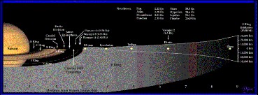 土 星 上 的 雲 帶 沒 有 木 星 般 明 顯 ﹐ 而 越 近 赤 道 的 便 越 寬 。 赤 道 上 的 帶 由 北 緯 40 度 南 延 至 南 緯 40 度 ﹐ 即 80,000 公 里 。 風 速 更 是 木 星 風 帶 的 三 倍 ﹐ 即 1,800 公 里 。 土 星 的 磁 場 是 地 球 的 540 倍 。 土 星 最 明 顯 的 三 個 環 分 別 是 A 環 ﹐ B 環 及 C 環 。 頁 頂 的 圓 中 ﹐ 最 開 的 是 A 環 ﹐ 在 它 外 邊 邊 懸 有 一 條 名 為 Encke 裂 縫 ﹐ 很 幼 小 的 。 較 粗 的 黑 線 是 Cassini 裂 縫 。 以 內 的 是 B 環 。 C 環 在 B 環 以 內 。 由 於 它 們 有 強 大 的 反 光 率 甚 高 ﹐ 估 計 大 多 數 是 由 冰 塊 組 成 ﹐ 小 的 只 可 像 沙 ﹐ 大 的 可 以 比 一 座 房 子 大 。 星 環 的 直 徑 約 250,000 公 里 ﹐ 但 厚 度 只 不 過 1500 米 。 如 困 其 實 土 星 環 的 物 質 不 多 ﹐ 把 它 們 壓 成 一 顆 衛 星 的 話 ﹐ 這 星 的 直 徑 不 會 多 於 100 公 里 。 其 如 的 請 看 看 下 圖 或 下 表 ﹕