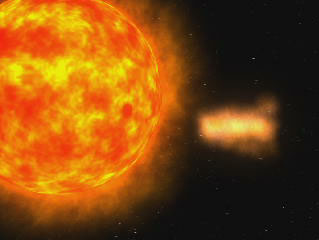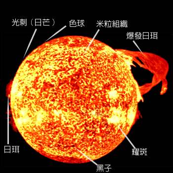 太陽 46億年前,一個恆星的末日爆炸,引起銀河系中一塊星雲的崩解,而這場崩解造就了另一個恆星─太陽。太陽在脫離了孕育它的星團後,成為一顆獨立的星球。太陽迸射出光和能,並慷慨地把它的熱給了圍繞它的九個行星。 讓我們把焦點對準太陽。首先映入眼簾的是翻騰的氣態表面,其上覆蓋著火焰。火焰被太陽核心加熱到6,000k,然後分解成直徑幾千公里的大氣泡,我們稱這些氣為「米粒組織」(granules),這些米粒組織每隔幾分鐘就噴出和回到太陽表面。接著,我們還會看到太陽綴有一些陰暗地帶,原來是伽利略最先發現的黑點。這些太陽黑子看起來陰暗,是因為它們比太陽表面冷上大約2,000k。太陽黑子綿延幾千公里,大小甚至會相當於一個小行星。 太陽表面的活動很頻繁,而太陽黑子就是太陽表現性情的地方。在整個太陽上,黑子不時會燃燒,噴出火舌,將物質迸發至太空中。有的會被磁場吸引,又落回表面,並且畫出弧光。這些火光向空間拋射出大量物質,這上由質子和電子組成的物質,後來加入因太陽外層蒸發而造成太陽風。