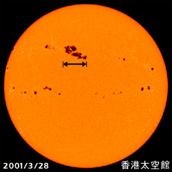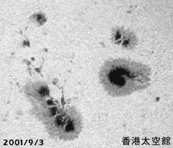 太陽黑子的平均數目,以11年為一週期而增加或減少。天體物理學家相信,這現象與太陽內部磁場會週期性重新排列有關。太陽像一塊有南北磁極的磁鐵:每隔11年,這兩極的方向互換。慧星的尾巴,是太陽風造成的。這些慧星,由核心開始形成,如滾雪球般愈來愈大,不時前來拜訪太陽系。它們筆直的模樣,是被太陽熱蒸發後的冰凍物質,與帶電粒子相互作用的結果。 黑子的溫度雖然比周遭稍低,但可別以為黑子的能量因而較小,黑子是太陽磁力束突出表面的接觸點,當磁力束強度持續增強,會引導太陽較內層的能量到表層,當這股能量突破太陽表層時,便成為大家所熟知的日冕(Corona),日冕將高達數百萬度的質子推向太空形成一股太陽風,太陽風會挾帶大量的帶電粒子往外擴散,如果遇到具有磁場的行星,這股帶電粒子便會沿著磁力線旋轉,落到行星的南北兩極(磁極),過程中帶電粒子會撞擊極區上空的氣體而釋放能量,使得極區上空出現各式各樣的極光。 2001年4月出現的大量黑子群之中,有一對黑子(編號9393,其直徑是地球的22倍)噴發一股強烈的太陽風,這幾天吹到了地球,便開始衝擊地球的地區,使得極光異常光亮,平常必須在阿拉斯加才看得到的極光,現在甚至在卡羅來納州(Carolina)、加州、新墨西哥州也看得到,這股十年來最強烈的太陽風將可能帶來衛星通訊的中斷,並干擾長途電信。並且北卡羅來納州的居民表示,最近晚間天空出現的極光是二十年來最壯觀的一次。下圖是美國NASA模擬次太陽風粒子衝出太陽表面的動畫。