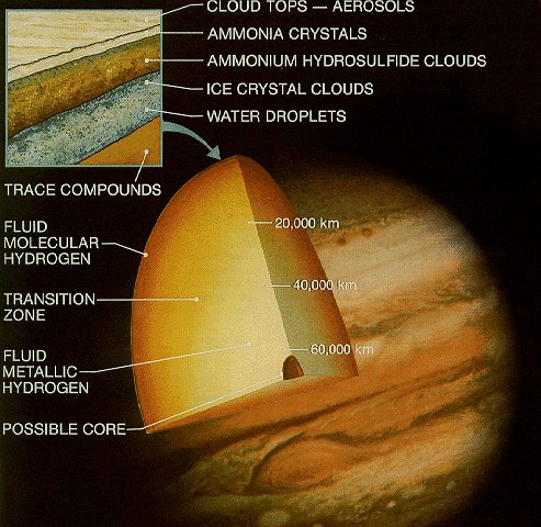 Liquid Metallic Hydrogen 中 含 有 離 子 化 的 質 子 及 電 子 ﹐ 與 太 陽 一 樣 ﹐ 可 是 溫 度 卻 低 得 多 。 外 層 則 是 氫 氣 及 最 上 層 平 常 照 片 可 以 見 到 的 主 要 是 雲 頂 ﹐ 阿 摩 尼 亞 (氨) 晶 體 ﹐ 氨 鹽 其 氫 流 化 合 物 ﹐ 水 晶 體 的 雲 ﹐ 及 水 點 等 。 跟 據 伽 俚 略 衛 星 及 其 深 入 木 星 大 氣 的 探 測 氣 的 資 料 顯 示 ﹐ 木 星 大 氣 是 非 常 乾 燥 ﹐ 而 不 是 以 前 所 想 的 ﹐ 傍 佗 大 雨 ﹐ 雷 電 交 加 。 最 大 的 問 題 是 ﹐ 當 年 那 探 測 器 進 入 的 地 方 是 木 星 當 其 時 是 其 中 一 處 最 暖 最 少 雲 的 地 方 。 而 在 木 星 最 上 層 的 雲 處 溫 度 與 密 度 比 以 前 估 計 的 高 得 多 。 溫 度 可 達 攝 氏 153 度 。 木 星 上 平 行 著 其 赤 道 ﹐ 不 同 顏 色 的 帶 因 有 不 同 溫 度 及 物 質 組 成 。 淺 色 的 稱 為 Zones ﹐ 而 深 色 的 稱 為 Belts 。 木 星 上 的 風 速 比 地 球 上 最 強 的 龍 卷 風 利 厲 得 多 ﹐ 達 每 小 時 640 公 里 ﹐ 深 至 木 星 頂 雲 內 的 數 千 公 里 。 木 星 有 一 個 非 常 強 大 的 磁 場 ﹐ 背 向 太 陽 一 方 的 磁 場 越 過 土 星 的 軌 道 (超 過 6 億 5 千 萬 公 里) ﹐ 而 面 向 太 陽 的 二 方 只 有 數 百 萬 公 里 。 伽 俚 略 深 測 船 探 測 到 在 木 星 環 與 木 星 頂 雲 之 間 的 磁 力 是 地 的 磁 場 強 度 的 十 倍 。 木 星 上 有 一 個 非 常 于 明 顯 的 星 環 ﹐ 這 環 主 要 由 石 塊 組 成 。 伽 俚 略 衛 星 發 現 木 星 環 上 的 物 質 不 會 逗 留 很 久 ﹐ 它 們 會 化 成 徽 形 隕 石 流 星 雨 撞 擊 四 個 最 近 木 星 的 衛 星 。 木 星 上 皂 環 分 別 是 ﹕ Halo 環 ﹐ 距 離 92,000 公 里 ﹐ 寬 30,500 公 里 主 環 ﹐ 距 離 112,500 公 里 ﹐ 寬 6,440 公里 及 Gossamer 環 ﹐ 距 離 128,940 公 里 ﹐ 寬 100,000 公 里。