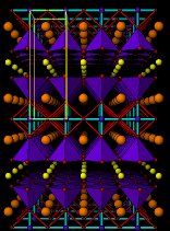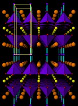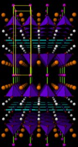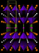 Dibujos en perspectiva de las estructuras de CaBa2Cu2HgO6 and Ca2Ba2Cu3HgO8 (Tc =130K). La pequeñas esferas blancas son iones Ca2+ , las esferas naranjas más grandes son iones Ba2+ . Las esferas azules átomos de cobre, las esferas violeta pequeñas representan átomos de Mercurio y las esferas rojas iones óxido O2- . La celda unidad se muestra en amarillo. Las pirámides azules representan los iones de cobre activos rodeados de cinco iones óxido O2- . Las barras verdes son enlaces entreiones Hg e iones óxido.