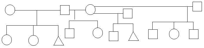 As you can see, the second woman over has had children by three men. Whether or not she was married doesn't matter on a genetic pedigree chart. We don't have any indication which one was first, but let's assume that the one on the left was first, the top right was second and the bottom right is last. From the lines, we can tell theat the woman has had seven pregnancies. There is one triangle, which might indicate a miscarriage, or the woman could be pregnant and not know the gender of the child. We can see that the woman's first man has another family by another female as well. These would be step-children to the woman's children.