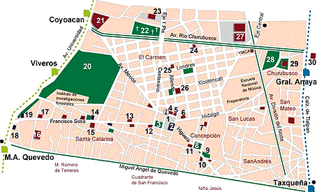 | Coyoacan Ubicado al sur de la Ciudad de Mexico Coyoacan es un sitio para ir a pasear por sus calles plazas, cafes, y el mercado ya tan tradicional, de cada fin de semana.Comiendote un Hot cake o una nieve se puede pasar una tarde inolvidable en este paraje colonial. Tambien parte de lo tipico de coyoacan es el mercado hippie que se ponen los domingos y ademas podras disfrutar de shows en vivo de mimos, bailarines de capueira, entre otras mas cosas que se presentan en esta plaza. Todo coyoacan es un lugar para gozarse. |