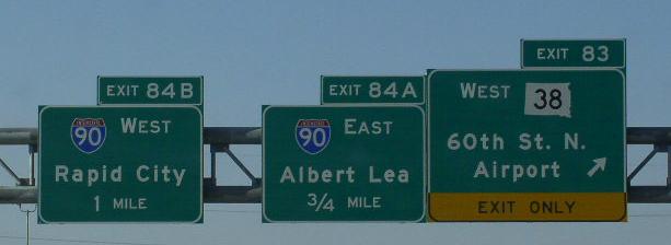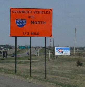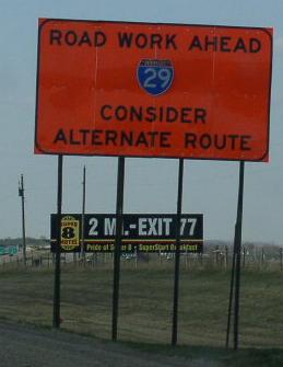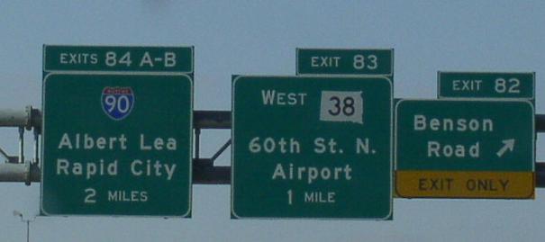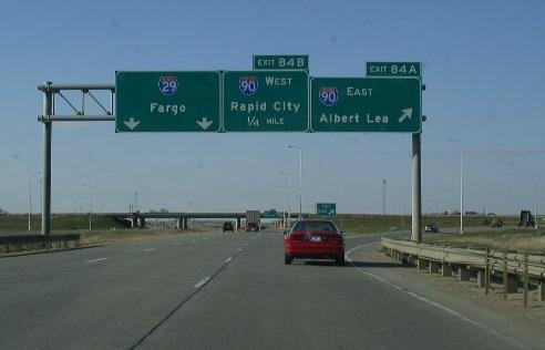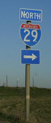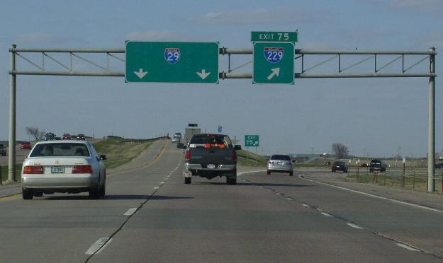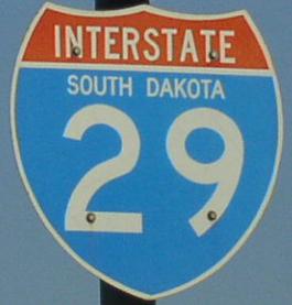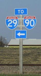 The first BGS for I-90 on NB I-29. BGS's on NB I-29 near I-90. NB I-29 at I-90. Branches of I-29 in South Dakota. NB I-29 at North Sioux City. NB I-29 near Jefferson. NB I-29 north of Elk Point. NB I-29 in Northern Union County. NB I-29 near Tea. A guide marker on WB Lincoln County Highway 106 (Exit 73). SB I-29 south of SD St Rt 38. A set of guild markers at Joe Foss Field in Sioux Falls. Sioux Falls Road Work; April, 2004