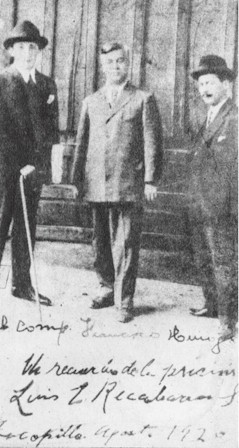 Recabarren nuevamente en la cárcel. El dirigente socialista obrero es apresado en Tocopilla, cuando había sido proclamado candidato a la Presidencia de la República. Le acompaña en la fotografía Ramón Sepúlveda Leal y otro dirigente socialista.