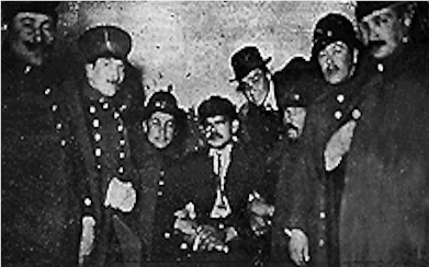 Los anarquistas de la IWW, jugaron un rol muy importante en la formación de las organizaciones obreras de las dos primeras décadas del siglo XX, siendo objetos permanentes de la represión policial. En la foto, un activista de la IWW es capturado por la policía de Santiago, que se ufana ante la prensa por su éxito.