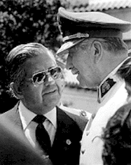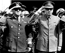 Arriba, Pinochet con los militares duros de la primera época de la dictadura: el General Gustavo Leigh, jefe de la Fuerza Aérea, que ordenó los Consejos de Guerra contra civiles, y el General Manuel Contreras, jefe de la represión, a través de la Dirección de Inteligencia Nacional (DINA), primero, y creador luego de la Central Nacional de Inteligencia (CNI), ambas de trágica memoria para los chilenos. Abajo, Jaime Guzmán Errázuriz, el padre de la institucionalidad dictatorial y de la Constitución de 1980, fundador de la Union Democrática Independiente, el soporte político más firme del pinochetismo. A su lado, Sergio Onofre Jarpa, que surgiera a la política nacional desde la neoderecha fascistoide, en las postrimerías del segundo gobierno de Ibañez, promovida por Jorge Prat. A principios de los 1960, ese sector copó el liderazgo de la derecha y fundaron el Partido Nacional, que conspiró para lograr un régimen autoritario.