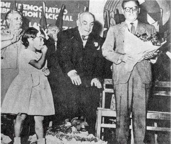 Allende 1952 La primera candidatura presidencial de Allende recibió el apoyo de los sectores más progresistas del país, poco significativos electoralmente, pero, con la clara idea de iniciar un proceso de concientización y organización. En la foto, Allende juntoael ex dirigente obrero Elías Laffertte y la dirigente comunista Julieta Campusano.