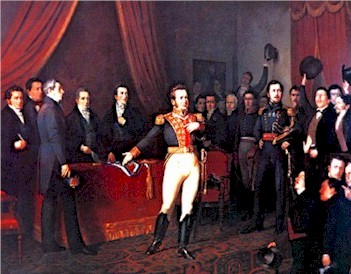LA ARISTOCRACIA DOMINA LA INDEPENDENCIA. La clase protagonista de la Independencia, fue la de los terratenientes. En la imagen, que representa la abdicación de O'Higgins a su cargo de Director Supremo, se advierte la exclusiva presencia de las familias prominentes de Santiago, y la inexistencia de los peones o campesinos.