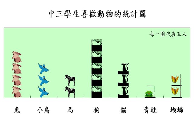 當數據經過處理後,我們可以表列形式顯示出數據。但為了使讀者更易明白和理解數據所帶出的含意,我們通常會用圖表來表示,這些依據數據來製作的圖表,我們統稱為「統計圖」。