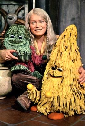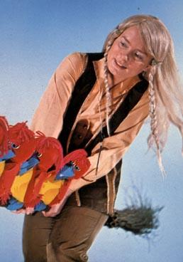 | There were more puppets in the program then the Dutch version of Sesamestreet ever had. Like in this picture on the left. They called Grobbebollen (Groentje een Geeltje). They were puppets on a string, who lived in Tika's bedroom. Later on in the show came a Grobbe-band and more actours, to make a surreal world where magicians and witches lived together with strange creatures. With Tika there also lived a real living chimpansee (also due to a wrong spell). And after one year the Grobbevogel laid eggs.. more trouble off course for Tika. The show was a real hit and all who watched it in the 70's is still a fan. |