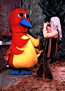 | The 'Grobevogel' is one of a kind... It was played by Teja Vossen. Though my website is only about Sesame Street Muppets, this large bird was as famous one like Pino. So I have to write about him! This childerens program was called "Ti Ta Tovenaar". (tovenaar-magician) The show aired from 1972 untill 1974. It came on for only 5 minutes a day. Each day one little story and one song about Ti Ta the magician and his daughter Tika. Who tried to learn her fathers magic. They lived in a castle on the clouds. |