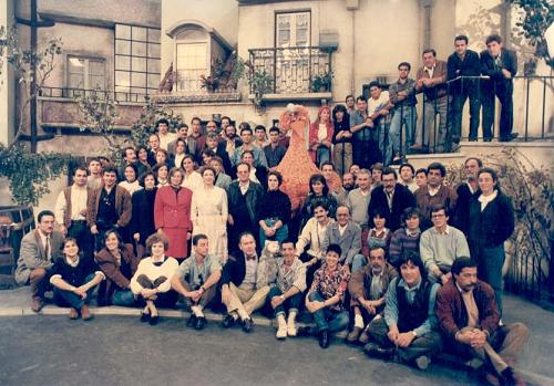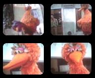 In 1989 Portugal got it' s own version of Big Bird in Rua Sesamo. A large orange bird with nice coloured feathers on her head and tail. On this goup foto you can see the cat Tita in the middle of the 1st row and at the left you slightly see the barrel where the grouch Ferrao lives in. |