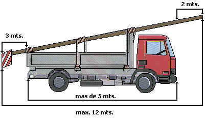 Si el vehículo mide más de 5 metros de longitud, la carga podrá sobresalir 2 metros por delante y 3 metros por detras, siendo la longitud máxima 12 metros.