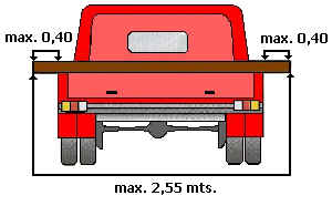 Si el vehículo mide 1 metro o más de ancho, la carga podrá sobresalir 0,40 metros desde cada lateral del vehículo, siendo la anchura máxima permitida 2,55 metros.