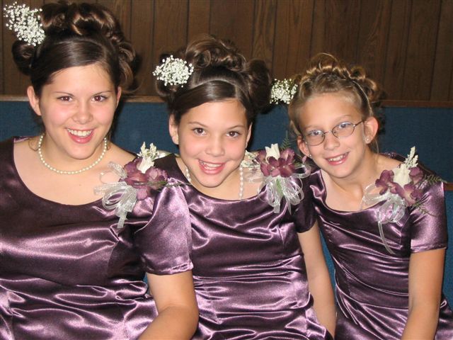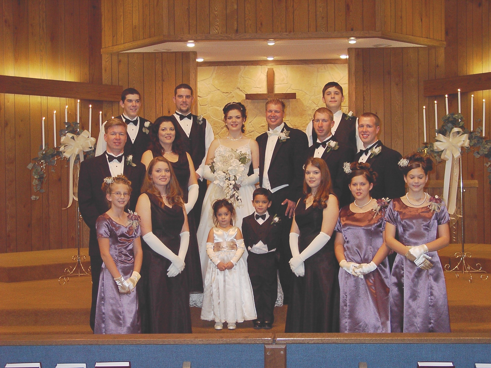 | THE WEDDING PARTY Top row: Ushers from left - Joseph, James and Michael (Mary's brothers) Middle Row: Groomsman-Jeremy , Matron of Honor- Jeanie (Mary's sister) , Mary, Doug, Best Man- Dallas , Groomsman-Daniel All of Dougs groomsmen were his brothers. Bottom Row - Jocy (Mary's niece), Aubry, Aurora (neice), Steven (nephew), Emily, Jac (neice) and Sarah (Mary's sister) All of Mary's attendants were her sisters. |