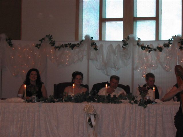 | A candle lit head table. You can just see the harpist to the right. She entertained us not only through the ceremony but for the rest of the evening as well You can just catch a glimpse of the harp on the picture to the left. Her music stand and the tallest part of her instrument. |
