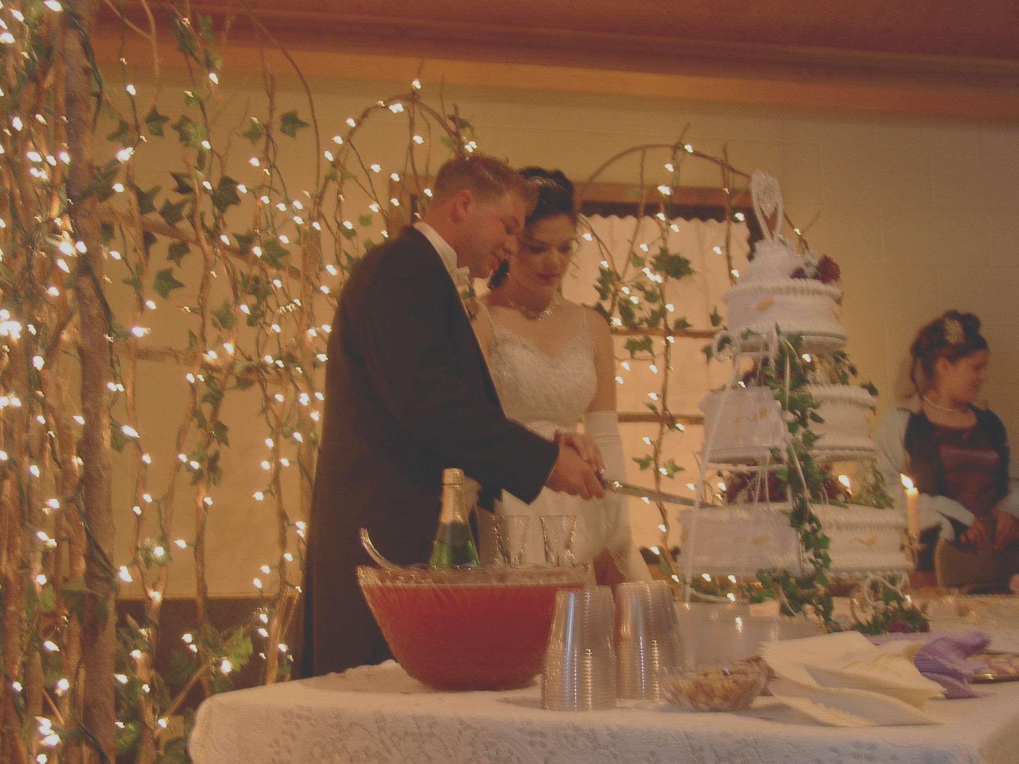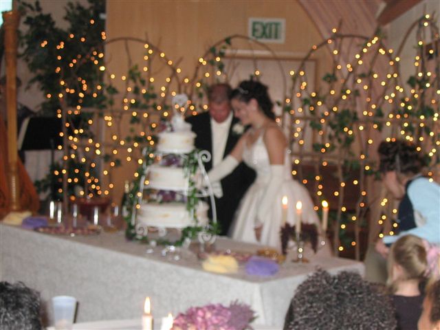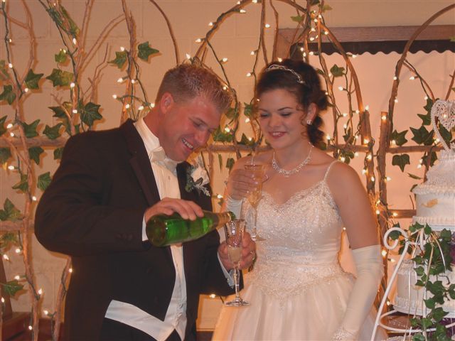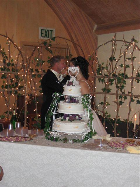 | Cuttin' the Cake and a toast with Sparkling Juice The cake was so beautiful, and this picture does not do it justice. The lady put plum colored flowers between layers and the ivy intwined on the cake stand went very well with it. On the sides of the cake you will see some gold colored frosting. Those are "wheat" that she "drew" onto the cake. We are in the high plains and the farming community is a vital part of the economy in these parts She makes, by far, THE BEST wedding cake we've every had. She's baked for us before. |