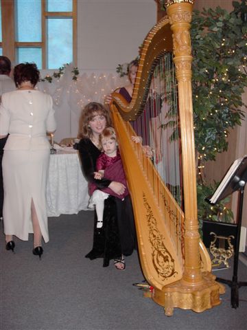| Dalene holding Julia. Dougs sister-in-law and niece. Jeremy's family. The harpist, Jane, is standing behind the instrument, it was built in 1948, and Jane is it's second owner. |