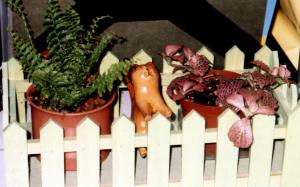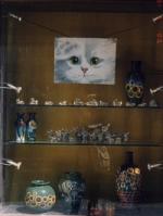 ☆在蕾絲店櫉窗裡的裝飾,把貓兒好奇地盯著玻璃杯裡的小老鼠的模樣描繪得栩栩如生.