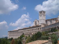 Basilica di San Francesco. 阿西西是聖方濟 (St Francis) 的故鄉。聖法蘭西斯大教堂 ( Basilica di San Francesco )是阿西西最重要的宗教聖地,教堂裡有著名藝術家喬托 (Giotto) 的溼壁畫 (fresco)。聖法蘭西斯大教堂座落在山腰上,背後襯著廣闊的鄉村田野,以及水藍色的天空裡飄浮著自在的白雲,從斜坡上往教堂看過去,有一種教堂浮在半空中的錯覺,它超越了芸芸眾生,用一種純潔的地位來引導世人進入心境的平和。