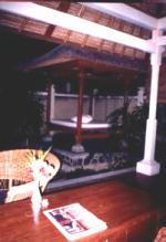 Sol Lovina. 位在 solvina beach旁面向著 Java Sea 的 sol lovina resort 擁有私人的海灘, 湛藍的天空和泳池, 高聳的椰樹, 還有悠閒的步調. 我們住的小別墅(villa)院子裡有自己的小泳池和發呆亭和沙發及桌椅,房間裡有個很大的浴室,裡面有一小塊土地上面開了天窗以採自然光種植觀葉植物.