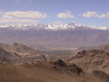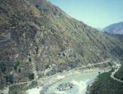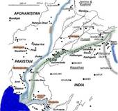 The Satellite image (above) clearly shows the Indus-Sarasvata river system extending from the Himalayas to the Arabian Sea. Here the Indus River is on the left, outlined in blue, while the Sarasvati River basin is outlined in green. The black dots are the many archeological sites or previous settlements along the banks of the now dry Sarasvati River.