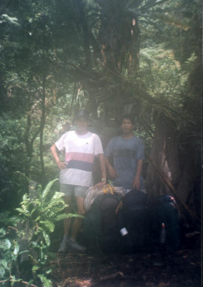 | Poised to succeed, Pedro and Dennis in Naathagan Camp situated in the lush rainforest at the foot of Mt Silay before the ascent of South Face Peak, prior to the First Ascent of Sewahon on August 31, 1999 (Photo by M. Porras) |