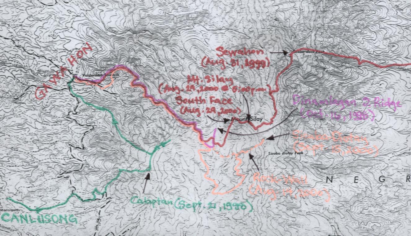 | Map showing the five attempts of the Singarong Backpackers to climb Mt Silay that resulted in the ascent of Dinamlagan, South Face, Sicaba-Diotay, Sicaba-Daku (Sewahon) and the incidental ascent of the true summit | |||||||||||||||||||||||||||||||||||||||