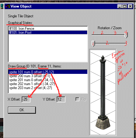 Depending on the type of object some rotations may be �flipped.� Use the method of flipping closest to the object the appears the way you want it to flip and rotate in the game. For example if none of the rotations are flipped, a certain formula will apply. If #1 & 4 are flipped a different formula would apply than if # 2 & 3 were flipped etc. These formulas refer to the Graphical States & the Draw Group ID�s(sprites) in Tmog. Each Graphical State will have an x & y coordinate for each Draw Group ID, and each rotations will be different, but follow a numerical pattern. In general if both x & y are 0 the object will not show, although this may not apply to all zooms.