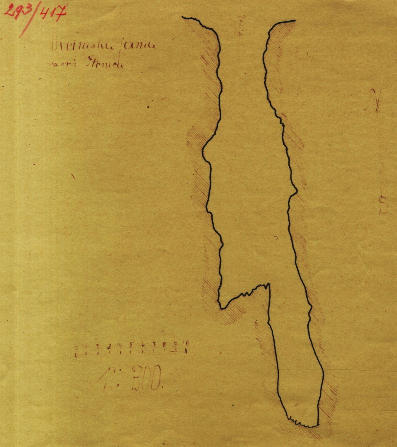 Morfološki opis objekta in okolice: Brezno globoko cca 37 na vrhu Strmca v gozdu. Oddaljen je od Borovnice približno 1 uro in pol in od Gornjih Otav pol ure. Vhod je približno pet metreov dolg in 1,80 m širok. Isti je vertikalen. Dno katero se deloma vidi iz vrha v nižini cca 24 m, tvorijo razne skale in polno gnijočih drv,tramov in hlodov, razne dolžine. Stene tvorijo goli kameni skladi,kateri so mestoma,zlasti proti vznožju izglodani od vode. Od vhoda v nižino približno 4-5 m so stene deloma poraščene z mahom. Dnevna svetloba prodira vse do globine 24 m. Skalnati skladi vodijo od N in padajo proti S odnosno S-W precej strmo. Podaljšek brezna vodi od tu za desno steno zopet razpoka v nižino cca 13 m rov. Nje stene so razmaknjene samo toliko,da je možno plezanje opirajoč se iz stene v steno. Na dnu je nekoliko drobnega kamenja in par kosti od srne. Stene so zelo zglodane od vode,kapniških tvorb ni opaziti.
