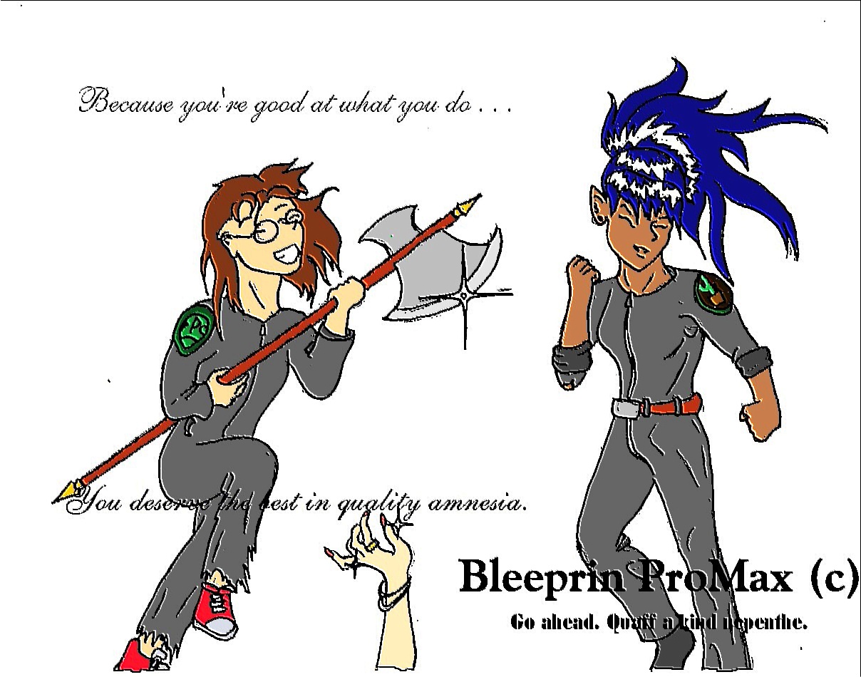 | Who knows what evil lurks in the hearts of men? Dunno. Here's a better question: who knows what exactly a bored high-school senior in British Literature will come up with? I'm not sure what Bleeprin ProMax is; it just sounded properly scientific in a pharmaceutical kind of way. "Quaff a kind nepenthe" is a quote from The Raven- "Quaff, o quaff this kind nepenthe and forget the lost Lenore!" (Quoth the raven, "What a bore.") Back to Artwork Back to the Response Center |